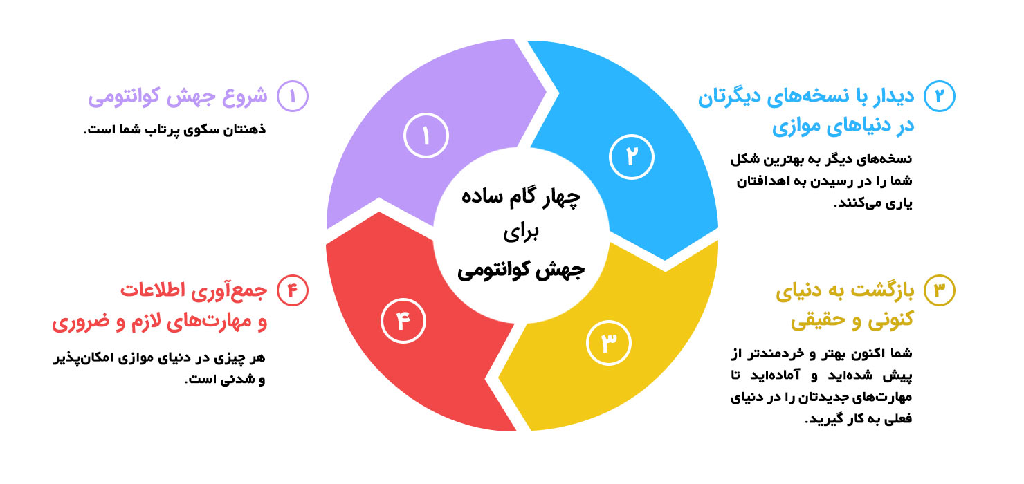 دورهی جهش کوانتومی یک برنامهی آنلاین است که به کمک آن و با استفاده از قدرت تجسم پیشرفته، مرحلهبهمرحله جهانهای موازی را کاوش میکنید، با «خودِ برتر» و نسخههای مختلفتان ملاقات کرده و از آنها در خصوص تحقق اهداف و خواستههایتان راهنمایی دریافت میکنید.