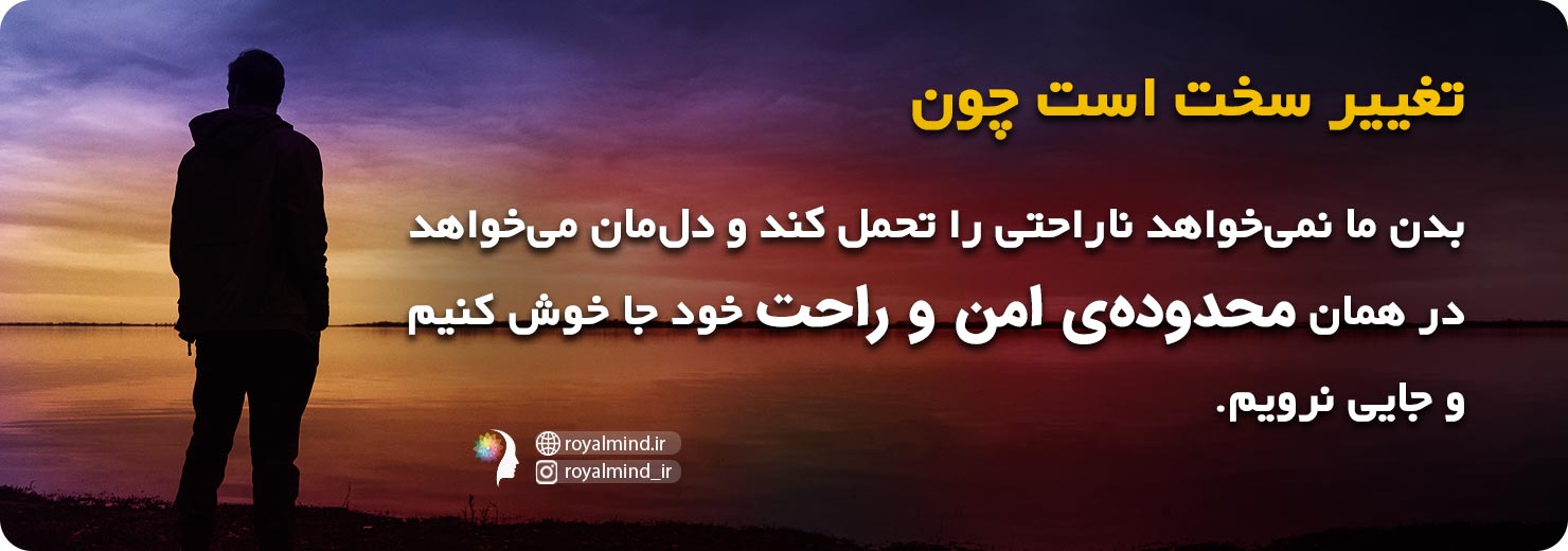 دومین چیزی که باید بدانید این است که «وقتی ما رفتاری را تکرار میکنیم و احساسات مربوط به آن در ما ایجاد میشود، پس از مدتی بدن ما به این احساسات که موادی شیمیایی هستند معتاد خواهد شد و ترجیح میدهد که هر روز همان مواد شیمیایی دیروز تولید شود زیرا برای تولید آن آماده و به اصطلاح تمریندیده است.» و همین نکته است که دلیل نکته قبلی است. ما اینطور رفتار میکنیم چون بدنمان اینطور میخواهد و ما نیز به خودمان زحمت نمیدهیم که کار دیگری انجام دهیم، زیرا برای ما (بدن ما) احساس ناراحتی خواهد داشت. خب جواب سوالتان را گرفتید، تغییر سخت است چون ما نمیخواهیم ناراحتی را تحمل کنیم و دلمان میخواهم در همان محدودهی امن و راحت خود جا خوش کنیم و جایی نرویم.