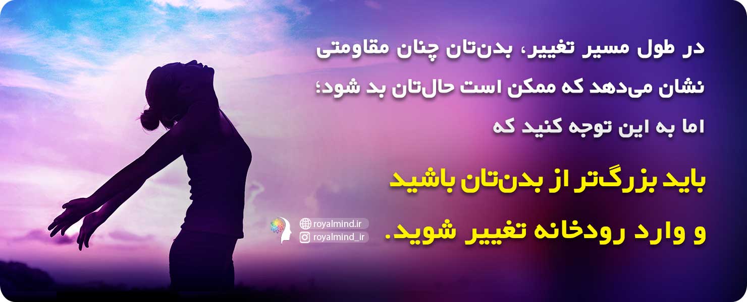 اگر بخواهیم تغییر کنیم باید از فیلسوف بودن به تازهکار بودن تبدیل شویم. یعنی اطلاعاتی که داریم را به حیطه عمل بیاوریم و آن را تکرار کنیم. تا مغز ما تغییر کند و پس از مدتی با تکرار این کارها از تازهکار بودن به استاد تبدیل شویم. مطمئن باشید که در طول مسیر بدنتان میخواهد به همان احساسات قبلی برگردد و چنان مقاومتی نشان میدهد که حتی حالتان خیلی بد شود. اما به این توجه کنید که باید بزرگتر از بدنتان باشید و وارد رودخانه تغییر شوید.