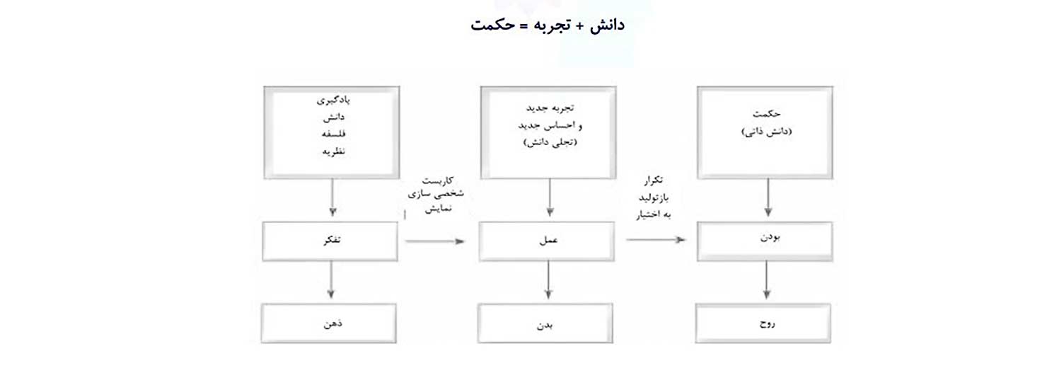 اگر دانش برای ذهن و تجربه برای بدن باشد، پس وقتی شما دانش را به کار میبرید و تجربهی جدیدی ایجاد میکنید، دارید چیزی را که ذهن به صورت ذهنی آموخته است به بدن آموزش میدهید. دانش بدون تجربه، فلسفهی خالی است؛ تجربهی بدون دانش، جهل است. شما باید این دانش را فرا گیرید و آن را زندگی کنید - و از نظر عاطفی در بر بگیرید.