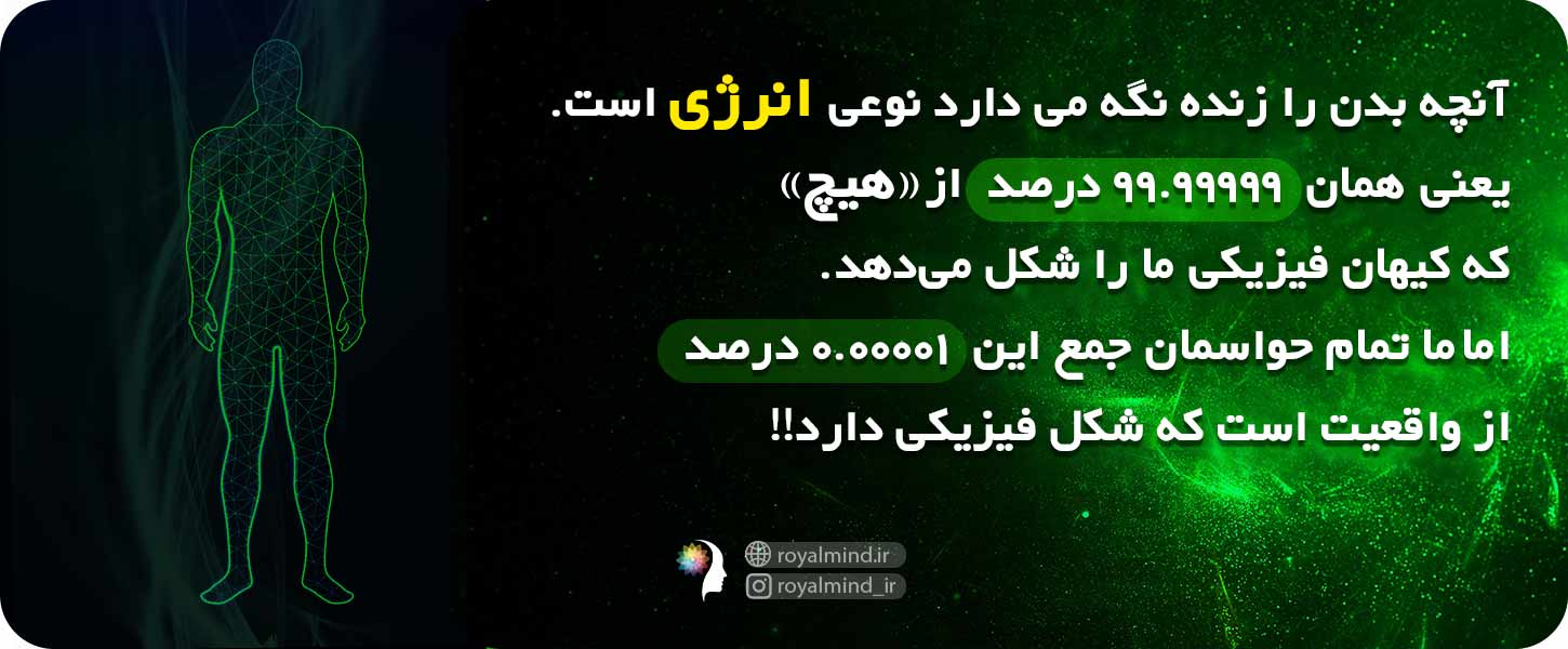 آنچه بدن را زنده نگه میدارد نوعی انرژی است یعنی همان ۹۹.۹۹۹۹۹ درصد از «هیچ» که کیهان فیزیکی ما را شکل میدهد. خندهدار نیست که ما تمام حواسمان جمع این ۰.۰۰۰۰۱ درصد از واقعیت است که شکل فیزیکی دارد؟