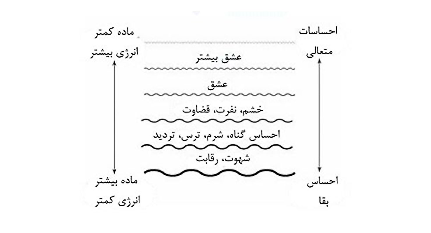 احساسات بقا، ما را در ماده بودن گیر میاندازند. احساساتی مانند خشم، نفرت، رنج، شرم، احساس گناه، قضاوت و شهوت باعث میشود ما احساس فیزیکی بودن کنیم، چون فرکانس آنها کُندتر بوده و به اشیای مادی نزدیکتر است. به هر تقدیر، احساسات متعالیتر مانند عشق، شادی و شکرگزاری، فرکانس بالاتری دارند. در نتیجه بیشتر شبیه انرژی و کمتر شبیه ماده هستند.همانطور که در پاراگراف و عکس بالا مشاهده کردید، ما احساسات متعالی مانند عشق، شادی و شکرگزاری را نیز داریم، وقتی این احساسات را داریم و فکرمان نیز با آن متناظر است، ما در حالت آفرینش هستیم که همان حالت عرفانی و طبیعی ماست، در ادامه میخواهیم با این حالت بیشتر آشنا شویم.