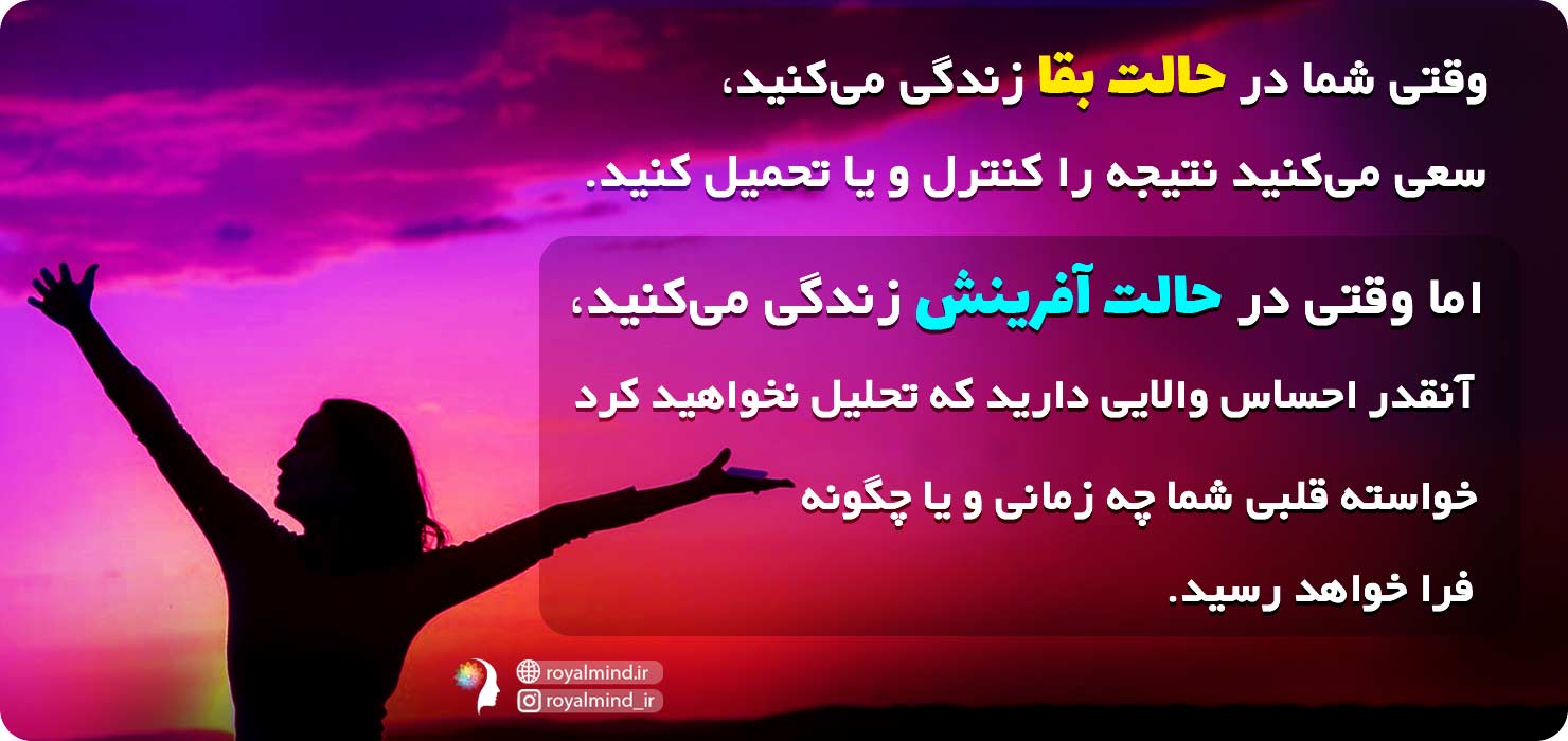در این مقاله میخواهیم هر کدام از این دو حالت را بررسی کنیم و ببینیم چگونه میتوانیم از حالت بقا به حالت آفرینش برسیم. اگر در حالت بقا و استرس و آشفتگی زندگی میکنید و تنها برای زنده ماندن میجنگید این مقاله را از دست ندهید. اگر هر روز شما کسالتبار و بدون خلاقیت و لذت است تا آخر مقاله با ما همراه باشید.