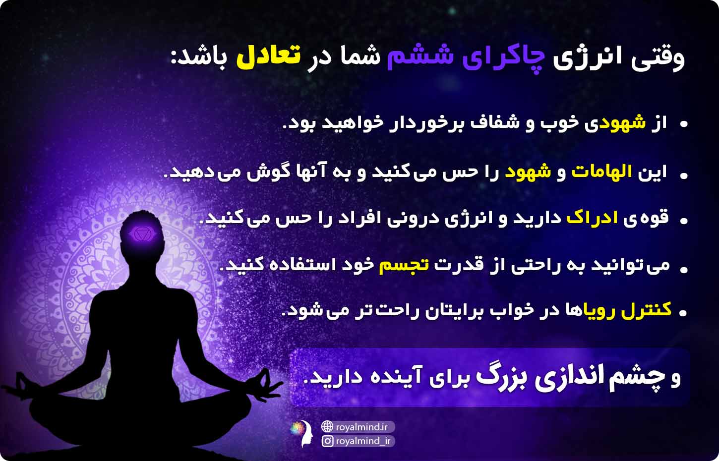 تعادل در چاکرای چشم شوم: زمانی که چشم سوم شما متعادل است، از شهودی خوب و شفاف برخوردار خواهید بود. این شهود را حس میکنید و به آن گوش میدهید. بصیرت و قوهی ادراک دارید و میتوانید درون مردم را ببینید. قوهی تخیل خوبی دارید و قادر به تجسم خلاق هستید. میتوانید به راحتی از قدرت تجسم خود استفاده کنید. در این حالت برای زندگی خود چشمانداز دارید. باز بودن این مرکز باعث افزایش وضوح فکری میشود.