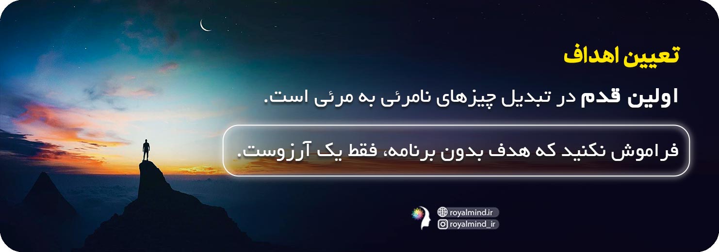 ۱) اهداف بزرگ خود را شناسایی کنید: با شناسایی اهداف بزرگ شروع کنید. اینها اهداف کلی هستند که میخواهید به آنها برسید. لطفاً مطمئن شوید که آنها مشخص، قابل اندازهگیری و قابل دستیابی هستند.