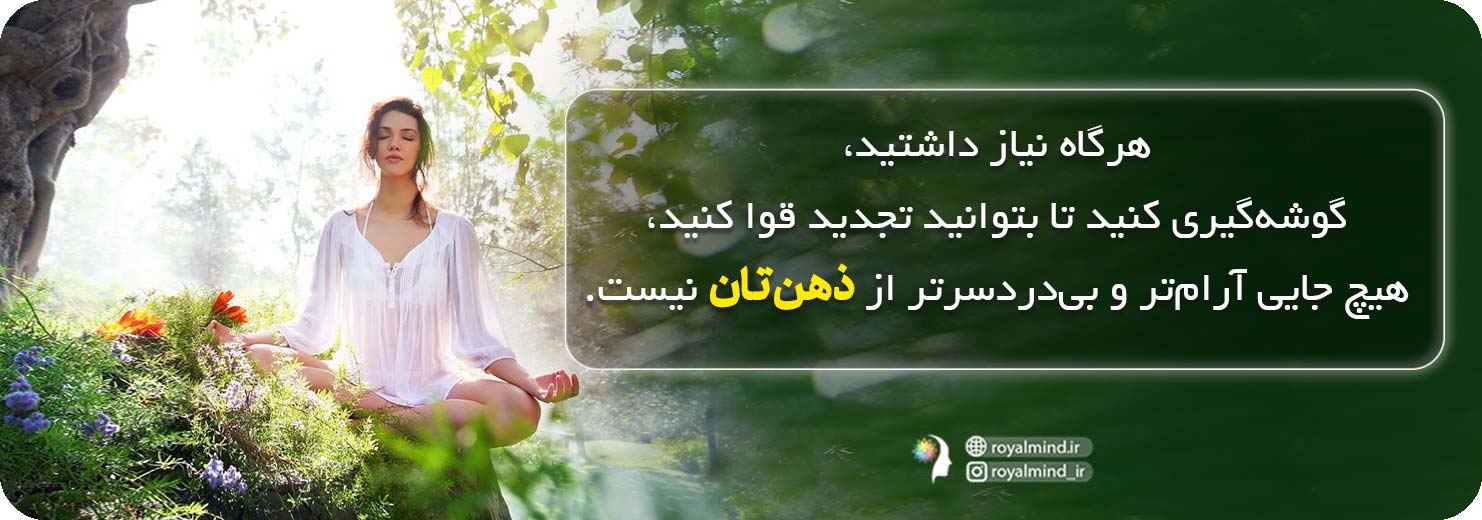 نقلقول محبوب آریانا هافینگتون، همه چیز را به زیبایی جمعبندی میکند: مردم گهگاهی گوشهگیری میکنند، حالا در کشوری، لب ساحلی، یا کنار دشت و تپههایی. اما هیچ جایی آرامتر و بیدردسرتر از ذهن خود ما نیست. بنابراین، هرگاه نیاز داشتید، گوشهگیری کنید تا بتوانید خود را تجدید کنید.
