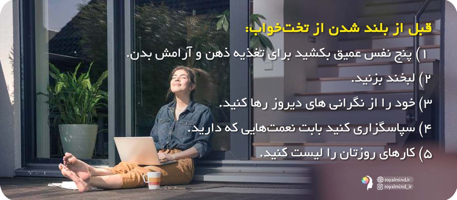 قدردان و شکرگزار باشید: برای چیزهایی که دارید سپاسگزار باشید و به جنبههای مثبت زندگیتان فکر کنید. هر شب یک یا دو دقیقه قبل از خواب وقت بگذارید تا اتفاقهای خوبی را که در آن روز رخ دادهاند، یادداشت کنید.